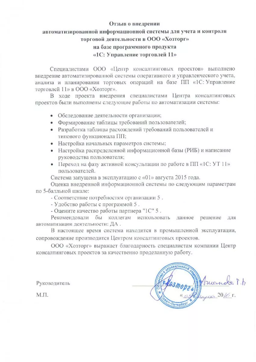 Внедрение программного продукта «1С:Управление торговлей 11» с целью автоматизации оперативного и управленческого учета, анализа и планирования торговых операций.