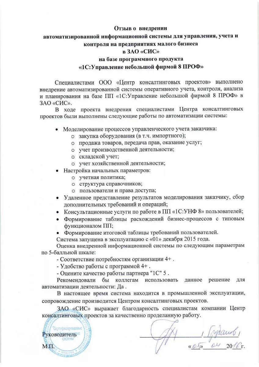 Внедрение автоматизированной информационной системы оперативного учета, контроля, анализа и планирования на базе программного продукта «1С:Управление нашей фирмой 8 ПРОФ».