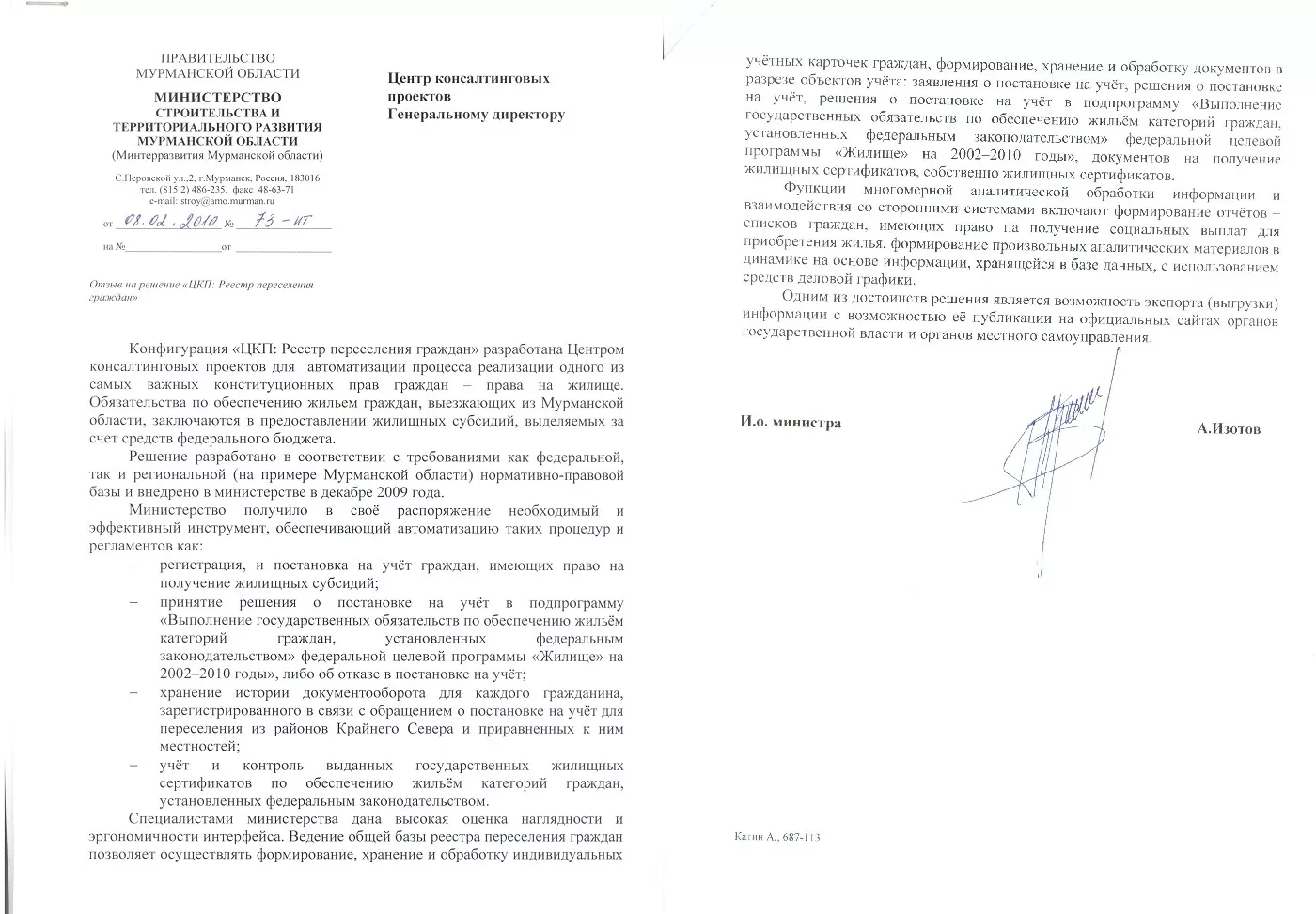Разработка и продуктовное внедрение специализированного решения «ЦКП:Реестр переселения граждан» на платформе «1С:Предприятие 8».