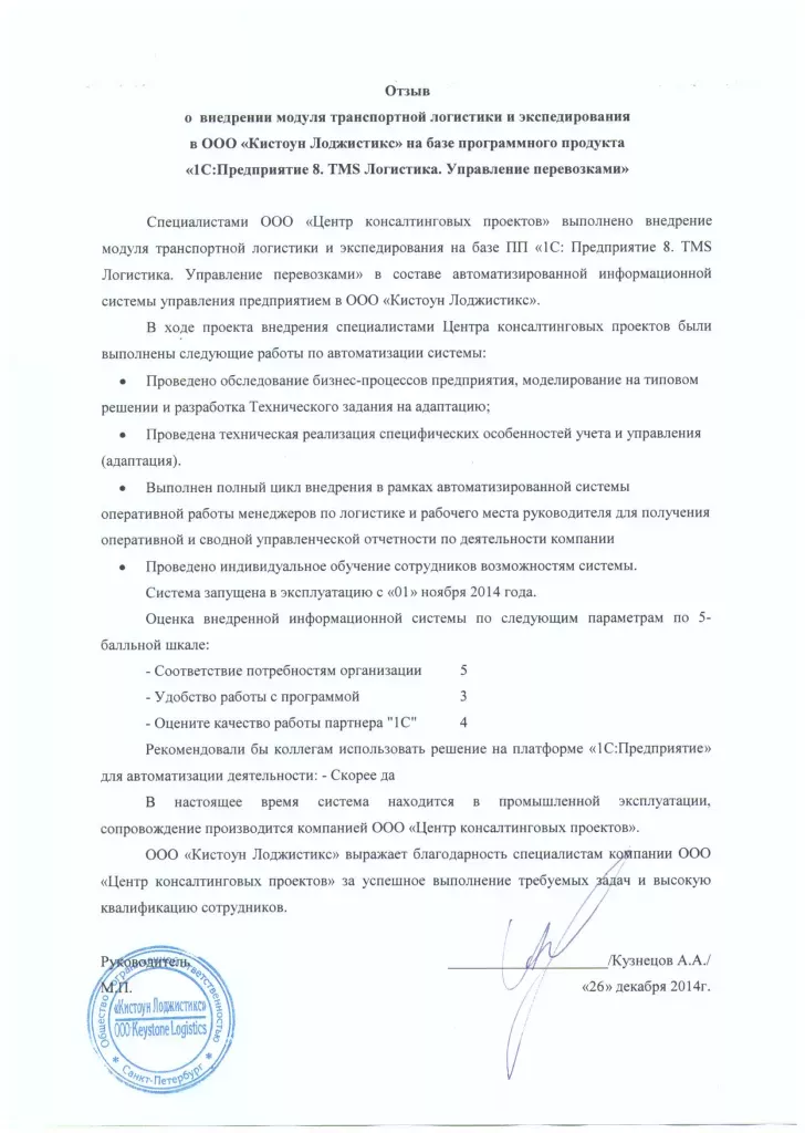 - В ходе проекта проведена адаптация конфигурации для реализации специфических особенностей деятельности заказчика и требований к формированию управленческой отчётности: 1. рабочее место менеджера по логистике для ввода и контроля данных по перевозке; 2. план/факт доходов и расходов, прибыли и рентабельности по сделке в различных валютах и в пересчёте на единицу груза; 3. расчет и отражение брокерской комиссии; 4. учёт взаиморасчётов; 5. учет движения товаров на складе, резервирование, контроль исполнения заказов поставщикам; 6. контроль наличия оригиналов документов по сделкам; 7. регламентные операции по расчету финансового результата; 8. органайзер: файлы, заметки, напоминания; 9. реализация специфических печатных форм; 10. настройка специализированных интерфейсов и ролей; 11. планирование и план-фактный анализ операций погрузочных терминалов, расчет потребности в таре и упаковке;